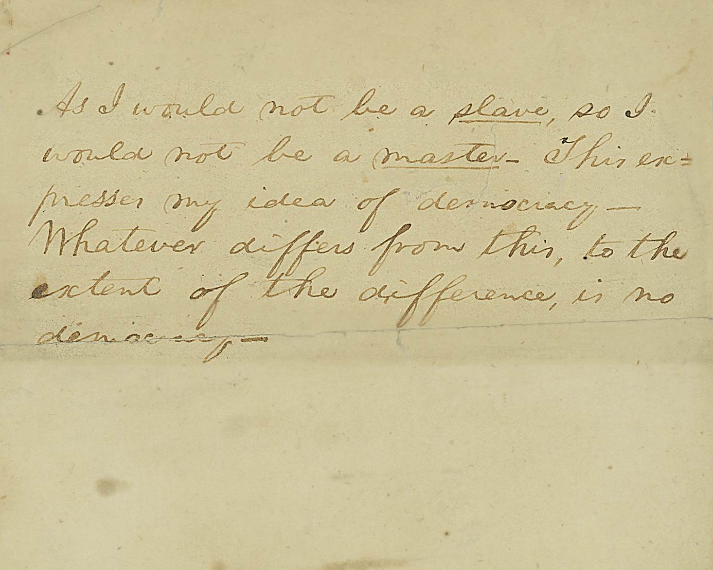“As I would not be a slave, so I would not be a master. This expresses my idea of democracy. Whatever differs from this, to the extent of the difference, is no democracy.”
