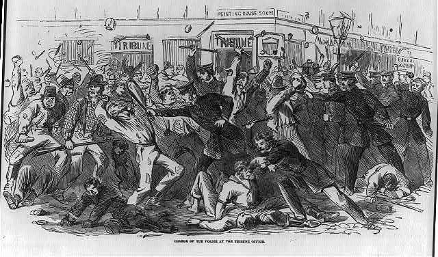 “Charge of the Police at the Tribune Office,” a depiction of the New York City Draft Riot in the 1894 Harper’s Pictorial History of the Civil War (Courtesy of the Library of Congress).