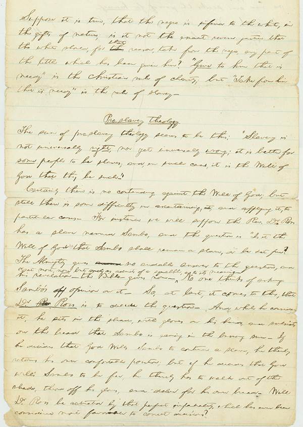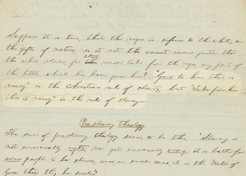 One of the best examples of this unique talent in his own handwriting comes to us from a document entitled “Pro-slavery Theology” here in the collections of the Abraham Lincoln Presidential Library and Museum.