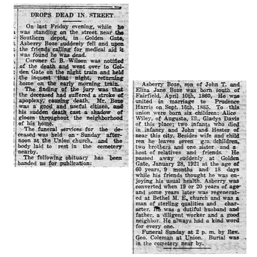 My husband’s third great-grandfather Asbury Boze, who passed away January 28, 1921, had the headline of “Asbuury (sic) Boze Drops Dead of Apoplexy” in the Wayne County Press dated February 3, 1921. This obituary stated, “Just as started to go he dropped over dead.”