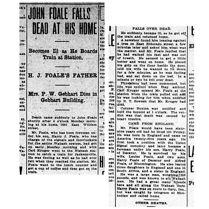 In looking at my own family tree, I have a couple examples of a surprising obituary due to the language used in it. My third great-grandfather John Foale, who passed away December 19, 1910, in Decatur, Ill., had the headline of “John Foale Falls Dead At His Home” in the Decatur Review dated December 19, 1910. In reading his obituary, it explains the manner of his death, which it was so sudden that “he fell over dead.”