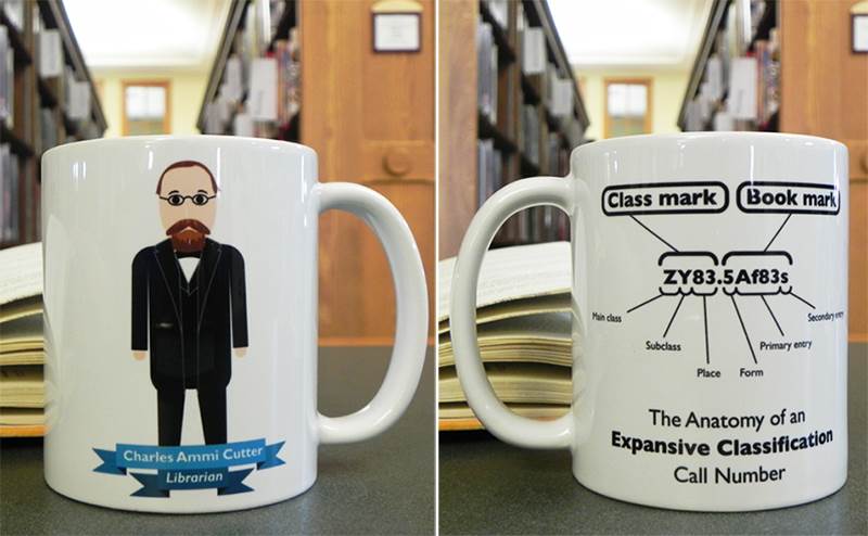 The Forbes Library in Northampton, Mass, where Charles Cutter once worked, sells a coffee mug with his likeness and an explanation of his classification numbers. Forbes is also home to the Calvin Coolidge Presidential Library and Museum.