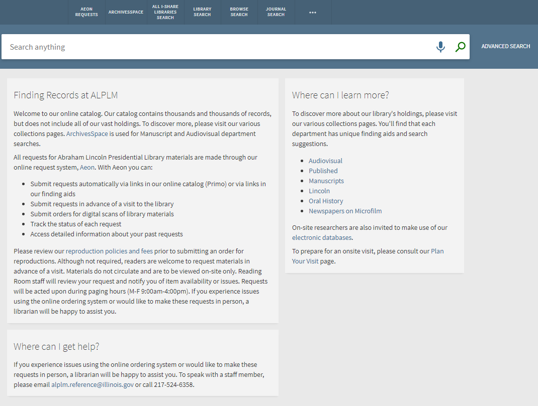 First, let’s take a look at the main search page. If you were in our Reading Room and I was giving you a tour of our resources in person, I would be quick to tell you what is and what is not in our catalog. Primo allows me the chance to do this digitally. Directly under the “Search anything” box, you’ll find information about what records you are searching, how to learn more, how to order materials, and how to contact us for help. Above the “Search anything” box are handy links to Aeon, our ordering system, and ArchivesSpace, the search interface for our Audiovisual and Manuscripts materials.