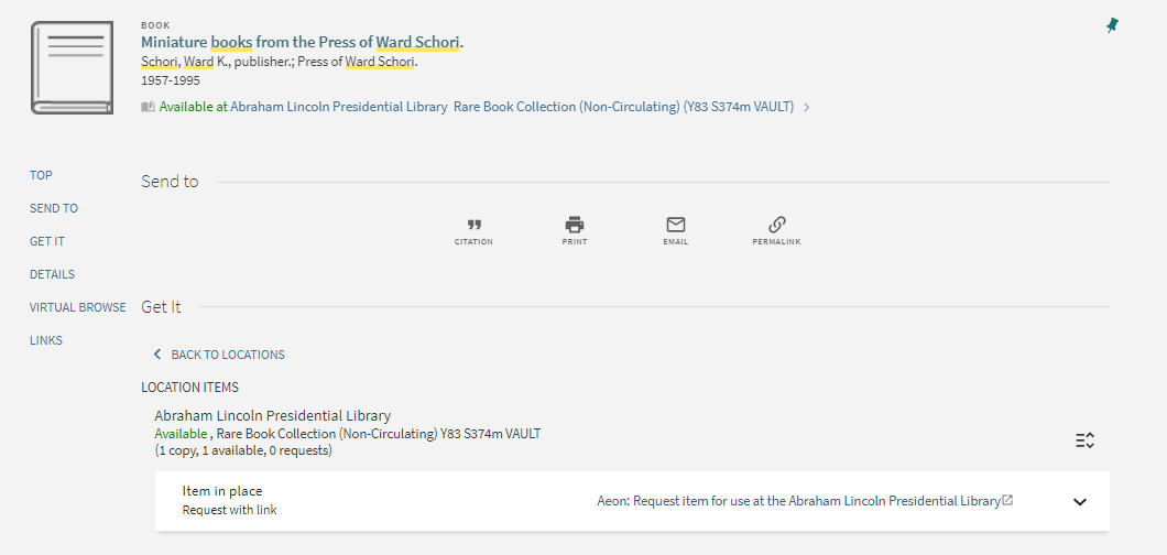 Now that we’ve done a search, it’s time to choose a record to investigate. Clicking the title in your search results will show you much more about the resource in question. How many pages does it have? Is it illustrated? When was it published? Is there something special about ALPLM’s copy? Many questions can be answered by consulting the “Details” section of a resource’s record. Just like our old catalog, you can click the “Request item for use at the Abraham Lincoln Presidential Library” link to order photoduplication or request to view the book in our Reading Room.