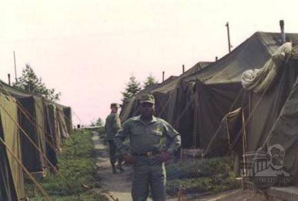 Specialist Bowen is flanked by tents his unit used as temporary shelter when on field maneuvers.
