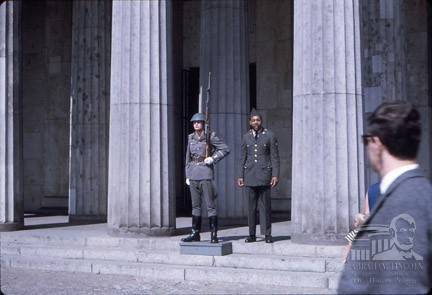 Rich Bowen stands next to one of the East German ceremonial guards during his visit.
