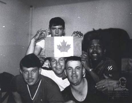 Bowen and several barracks mates have some fun. Specialist Baker, from Canada, displays the Canadian flag.