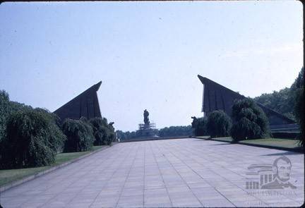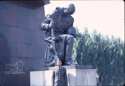 Specialist Rich Bowen stands in front of one of the statues that marked the entrance to the Soviet War Memorial, taken during his visit.