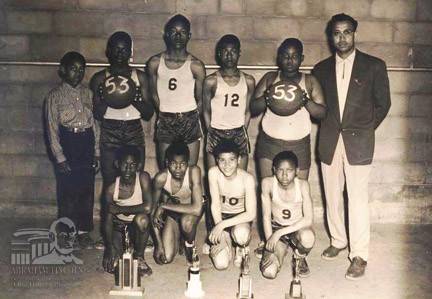 The 1953 Colp Attucks Grade School basketball team. Top, left to right Richard Bowen, Jr., manager, Willie Williams, Ivan Jefferson, Lary Martin, Sef Vinson and Samuel L. Webb, coach. Front, Oran Dillard, Raymon Kincaid, Sonny Brown, and Ebert Herrison.