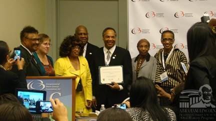 Dressed as Harriet Tubman, Harris poses with other speakers and guests at the Annual Legislative Conference, including Diane Miller, Representative Corrine Brown, Roger G. Stanton, and Addie Richburg.