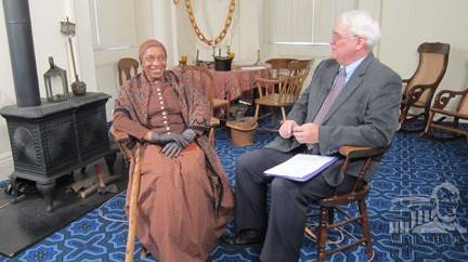Kathryn Harris, as Harriet Tubman, and interviewer Mark DePue on January 10, 2013 in the Governor’s Reception Room of the historic Old State Capitol in Springfield, Illinois.