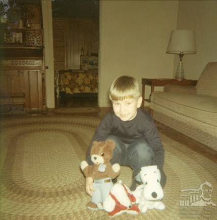 Alan plays with his Smokey the Bear and Snoopy stuffed animals on the floor of the family’s farm house, circa 1970.