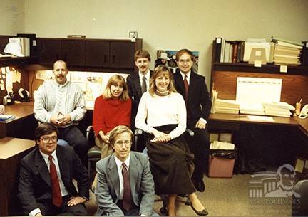 In 1989 Alan worked at the Reagan project in Los Angeles (prior to the construction of the Reagan Library). His fellow archivists were Warren Finch and Kelly Barton (front) with Greg Cumming, Kate Sewell, Ernie Emrich, Linda Fischer and Alan in the back.