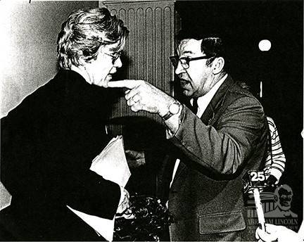 Mary Lee Sargent confronts an Illinois House gallery guard (a ‘Red Coat’, veterans who helped on the floor) during a Halloween protest for women’s rights in 1985.