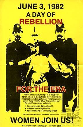 This poster was used in 1982 to rally support for more dramatic action to gain passage of the ERA Amendment in the Illinois legislature as time was running out. The Illinois legislature failed to adopt it that year, and ERA went down to defeat.