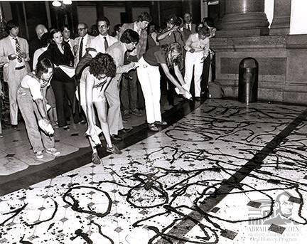 When ERA went down to defeat, ERA activists showed their disapproval by writing the names of their opponents in pigs’ blood outside the governor’s office on June 25, 1982. LtR are Ann Casey Elder, Sue Yarber, and Mary Lee Sargent.