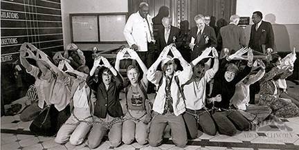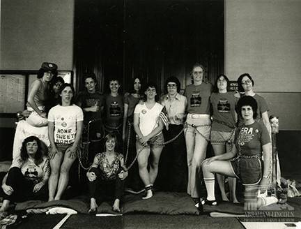 Those who chained themselves outside the IL Senate chamber on June 3, 1982 included, LtR Pauline Kages, ?, Jane Olsen, Sue Yarber, Kari Alice Lynn, Mary Lee Sargent, Joyce Meyes, Alice Webber, Page Mellish, Berenice Carroll and Loretta Manning.