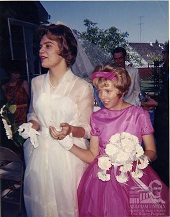Suzi Sargent accompanies her sister Mary Lee at Mary Lee’s wedding to Gerald Clore in Walnut Creek, California in June 1962. Gerald is following close behind.