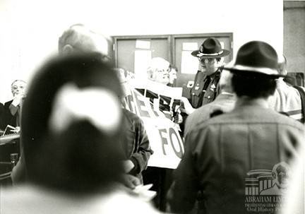 Mary Lee Sargent and Illinois Secretary of State Police, who provide security in the capitol building, during a protest for a house bill adding sexual orientation to the Illinois Human Rights Act in 1999.
