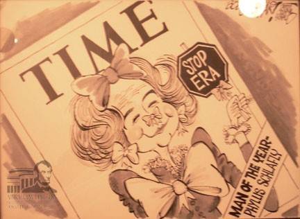 Schlafly is lampooned in this 1978 political cartoon by Ed Fischer, depicting her as Time Magazine’s 1978’s Man of the Year.