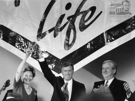 Phyllis Schlafly, Vice President Dan Quayle and Jerry Falwell share the stage at the Republican National Coalition for Life Rally during the 1992 Republican National Convention in Houston.