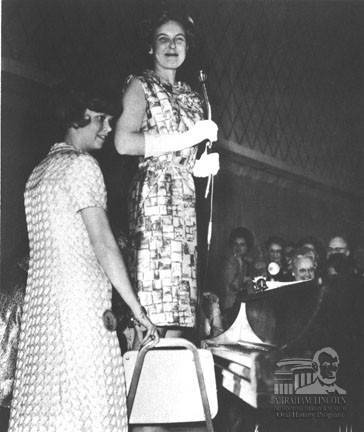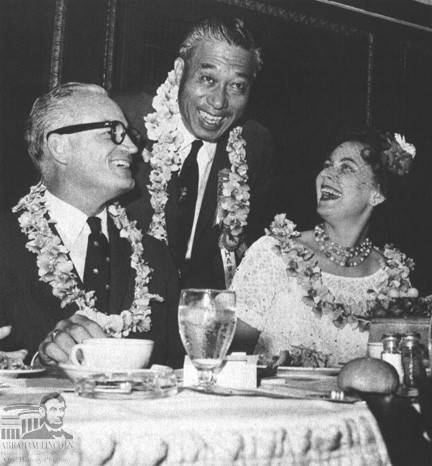 In July, 1960 Mrs. Schlafly hosts an event for Senator Barry Goldwater of Arizona. Senator Hiram Fong of Hawaii shares a laugh with them. Four years later, Schalfly’s book, A Choice Not an Echo helped propel Goldwater to the Republican nomination.