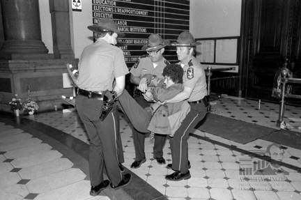 A pro-ERA activist, one of a group of women who had chained themselves to the railing outside the Illinois Senate chamber, was physically removed from the capitol by Secretary of State police at 4:00 AM on June 7, 1982.