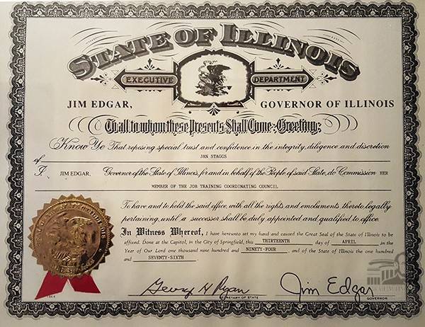 Jan received this State of Illinois certificate from Governor Jim Edgar in April 1994 in recognition of his work with the state’s Job Training Coordinating Council.