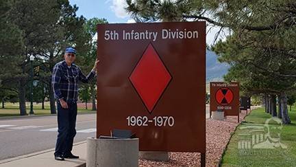 Jan Staggs stands next to a sign for the 5th Infantry Division at Ft. Carson, Colorado during a recent trip in 2016. He was stationed there for five months in 1966, learning personnel duties on-the-job.