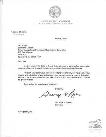 Jan Staggs received this letter from Gov. George Ryan on the occasion of his retirement from the Illinois Occupational Information Coordinating Committee in May, 1999.