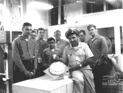 From left to right, Tony, Edward Schroder, Ken Kern, Paul Love, Kenneth Anderson, Chief Petty Officer Femino, Charles Thurston, and Paul Sweet gather in the carpenter/pattern shop aboard the USS Canopus AS #34 to celebrate Femino's birthday.