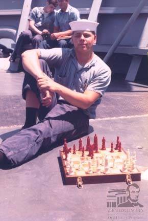 Paul Sweet participates in a noon-hour chess game, sitting on the bow of the USS Canopus AS #34. He served on the ship from June 1966 through July, 1968, which was assigned to the Atlantic Fleet.