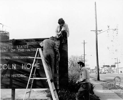Tom Pacha and two other National Park Service employees worked on putting up the first sign for the Lincoln Home National Historic Site in 1971.