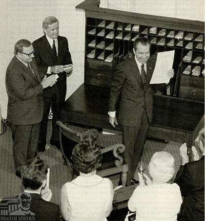 President Richard Nixon signed legislation authorizing the establishment of the Lincoln Home National Historic Site at the Old State Capitol in Springfield, Illinois, on August 18, 1971. Governor Ogilvie and Congressman Findley are in the back.