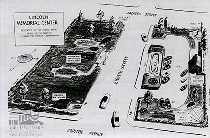 This 1925 sketch shows the proposed Municipal Group to be built around the Lincoln Home, and included the Lincoln Home and structures plus a large auditorium, as well as a new City Hall building and a number of columned memorials and museums.