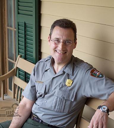 Tim Townsend takes a moment to relax on the back porch of the Lincoln Home in July 2008.