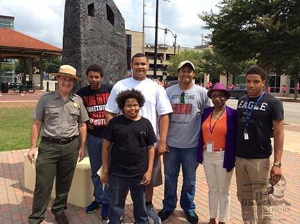 Tim Townsend (left), Kathryn Harris (red hat), and several young men stand in front of the 1908 Springfield Race Riot Memorial, designed by Preston Jackson, which was unveiled in August 2009.