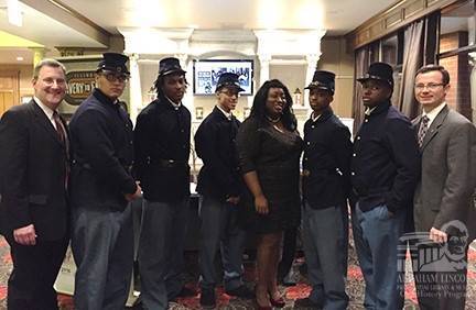 Townsend (left), Titi Sai (center) and Justin Blandford (right) of the Illinois Historic Preservation Agency, joined several members of the Spirit of Lincoln Youth Leadership Academy dressed as Union soldiers in the visitor center circa 2015.