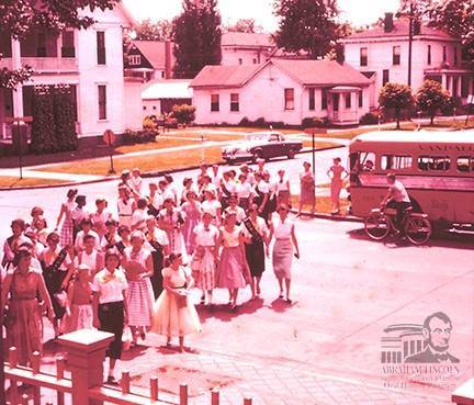 Young women have left a bus and are headed toward the Lincoln Home during a school visit to the site in the 1950s.