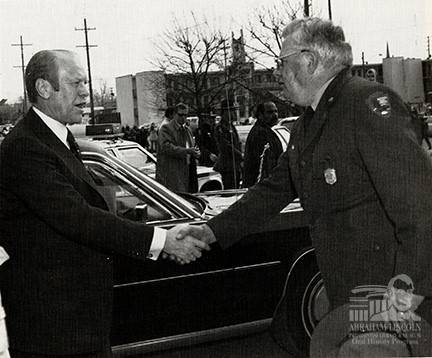 President Gerald Ford arrived at the Lincoln Home National Historic Site on March 5, 1976 for the dedication of the Visitor Center. He was greeted by Albert W. Banton, Jr. the first superintendent of the Historic Site.