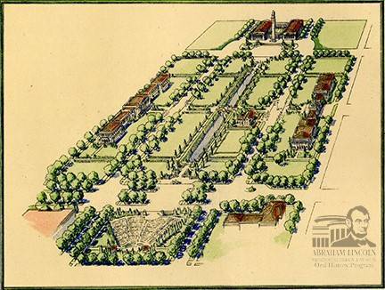 An artist’s rendition of the Lincoln Memorial Center, a proposed layout for the Lincoln Home area being considered in the mid-1950s. Additions included a band shell, a souvenir shop, the Lincoln birthplace, and a statue of George Washington.