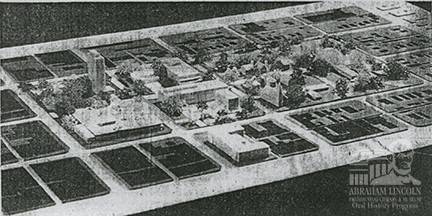 This model of the Civic Center plan for the Lincoln Home area dates from 1957. It included a city hall, county building, a parking garage, a civic auditorium in a geodesic dome, and a Lincoln museum with historic structures.