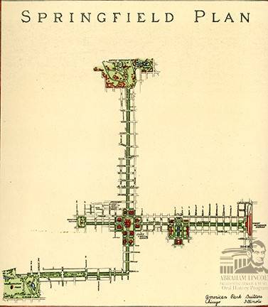 A 1925 map of the proposed Municipal Group for Springfield, Illinois, with greenways connecting Washington Park, Lincoln Park, the State Capitol, the Governor’s mansion, the Lincoln Home area, and the proposed Union Station.