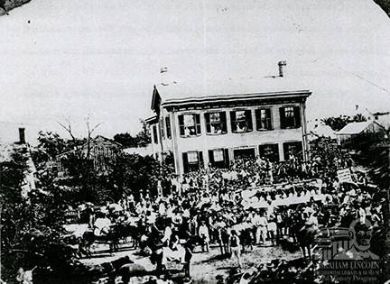 Lincoln supporters gathered outside the Lincoln home in Springfield for a political rally in 1860. Lincoln himself is dressed in white and standing near the door of the house.