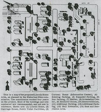 A map of the Historical Sites commission’s plan for the Lincoln Home Area from 1966 included the Lincoln home and carriage house, the Corneau Home information center, extensive parking, and other restored historic homes.