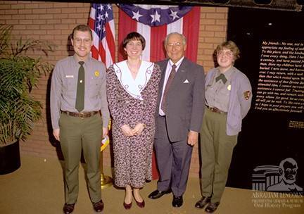 Tim Townsend (left) and Susan Haake (right) took their photo with U.S. Representative Robert Michel and Linda Norbut Suits of IHPA during Michel’s visit to the Lincoln Home National Historic Site in 1993. The home was in Michel’s district.